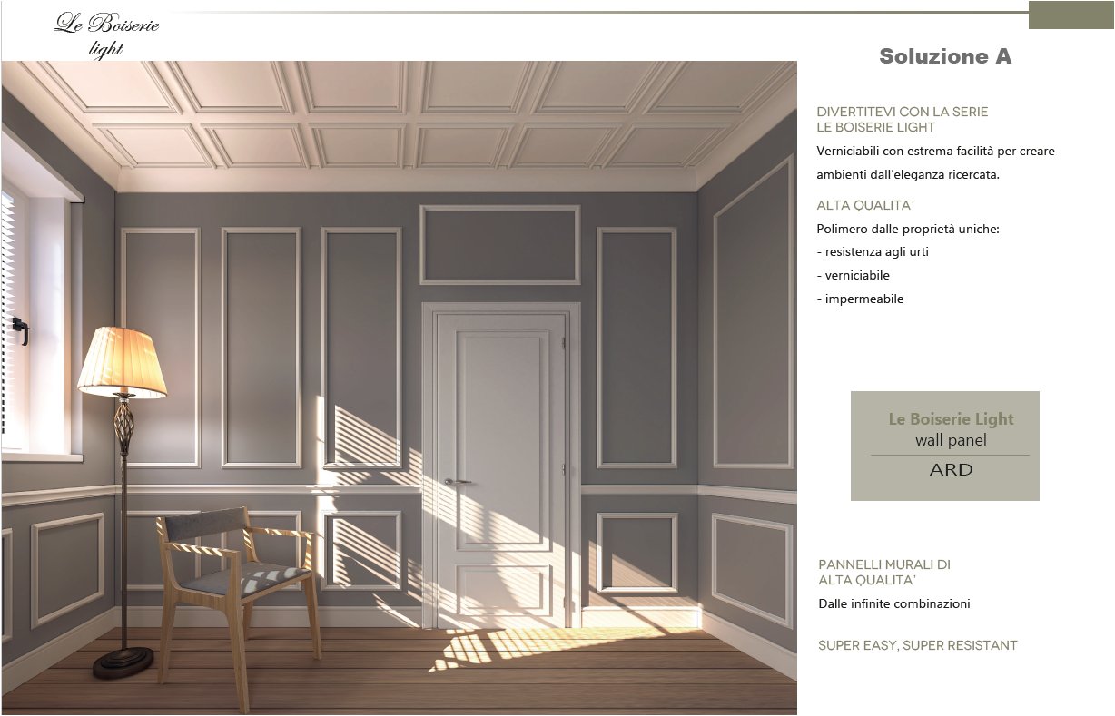 Trasforma velocemente le tue pareti con le Boiserie Light della ARD. Pannelli in duripolimero in grado di rivoluzionare i vostri ambienti, donando alla stanza eleganza e raffinatezza senza pari.
